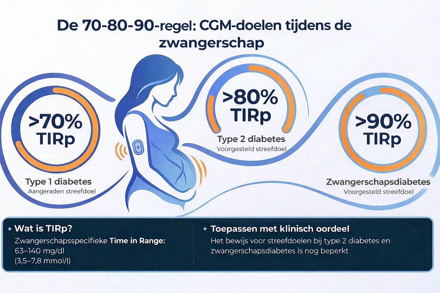 Belangrijke kanttekening: de consensus benadrukt dat robuust wetenschappelijk bewijs voor CGM-streefwaarden bij zwangere vrouwen met type 2 diabetes en bij zwangerschapsdiabetes nog beperkt is. Deze streefwaarden moeten daarom met klinisch inzicht worden toegepast en niet als strikte grenswaarden.